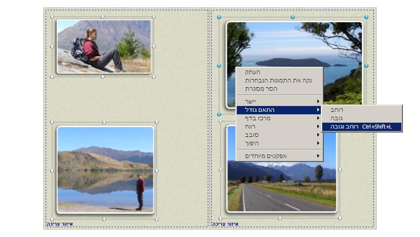 4. ללחוץ על אחת התמונות עם הלחצן הימני של העכבר ולבחור באופציה "התאם גודל" -> "גובה ורוחב"